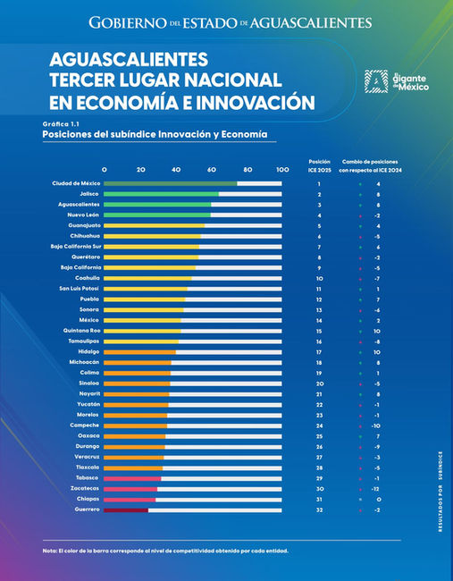 Aguascalientes se ubica como el tercer estado del país con mejor desempeño en innovación y economía, solo detrás de la Ciudad de México y Jalisco, según el Índice de Competitividad Estatal 2025 del Instituto Mexicano para la Competitividad (IMCO).