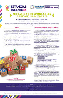 También se deberá presentar constancia de situación fiscal de la persona física o moral; hoja de cumplimiento de obligación fiscal actualizada; documento vigente que acredite la propiedad, arrendamiento o comodato del inmueble donde se encuentra la Estancia Infantil; comprobante de domicilio de la Estancia Infantil, no mayor a 3 meses de antigüedad; comprobante de domicilio particular de la persona responsable, no mayor a 3 meses de antigüedad; Programa Interno de Protección Civil aprobado y con documentación vigente; licencia de funcionamiento; cédula de evaluación; carátula de estado de cuenta a nombre de la persona física o moral en donde se manifieste la CLABE interbancaria; póliza de seguro de responsabilidad civil vigente; copia del reglamento interno de la Estancia Infantil.