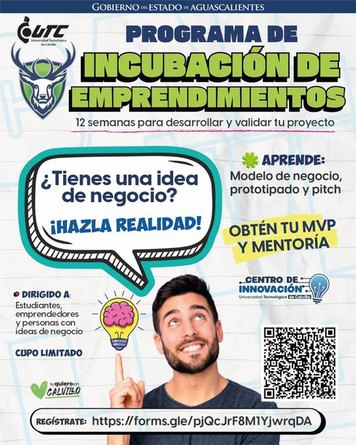 Incubación de Emprendimientos, con una duración de 12 semanas, se enfoca al desarrollo de proyectos y se dirige a emprendedores y estudiantes. Las y los interesados podrán registrarse en el siguiente enlace:https://docs.google.com/forms/d/e/1FAIpQLScKQpXaZwIWOio3VglIEplKw-yiNnvJp_NgkRjaIxukgZbFSw/viewform.